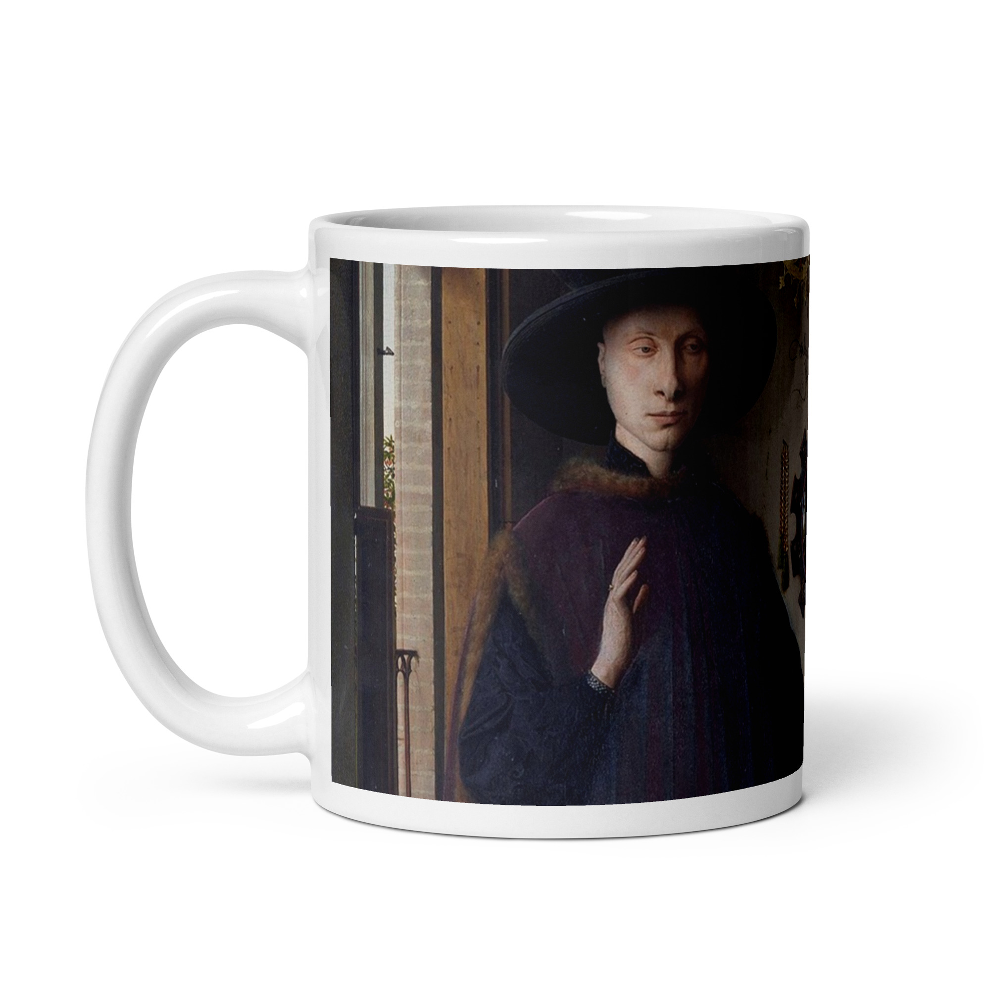 Esta obra maestra, célebre por su extraordinaria precisión técnica, destaca por su riqueza de texturas, luz y detalles cotidianos cargados de significado. El espejo convexo del fondo, los objetos cuidadosamente representados y la atmósfera íntima convierten la escena en un mundo en miniatura lleno de secretos visuales. Esta taza decorativa de arte transforma tu rutina diaria en un momento de cultura y contemplación, aportando sofisticación histórica a tu hogar o espacio de trabajo.